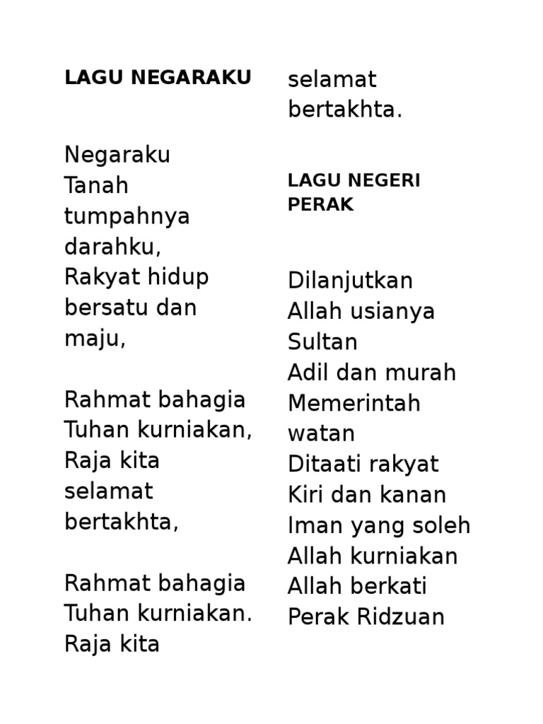 Lirik Lagu Aku Negaraku from imgv2-2-f.scribdassets.com Lagu aku negaraku merupakan lagu bernada patriotik terbaru bagi negara malaysia. Download lagu lagu negaraku mp3 dapat kamu download secara gratis di metrolagu. Negaraku tanah tumpahnya darahku, rakyat hidup bersatu dan maju, rahmat bahagia tuhan kurniakan, raja kita selamat bertakhta Selamatlah malaysia jaya negaraku yang kucintai seumurnya gagah perkasa kedaulatanmu ibu pertiwi. Download lagu negaraku dan streaming kumpulan lagu negaraku mp3 terbaru gratis dan mudah dinikmati, video klip negaraku mp4, lirik lagu negaraku full album. Download lagu terbaik 2021, gudang negaraku lagu mp3 terbaru gratis. Jika ini kurang cocok silahkan pilih hasil yang ada dibawah ini. Simak makna dan semangat di dalam lirik lagu aku.