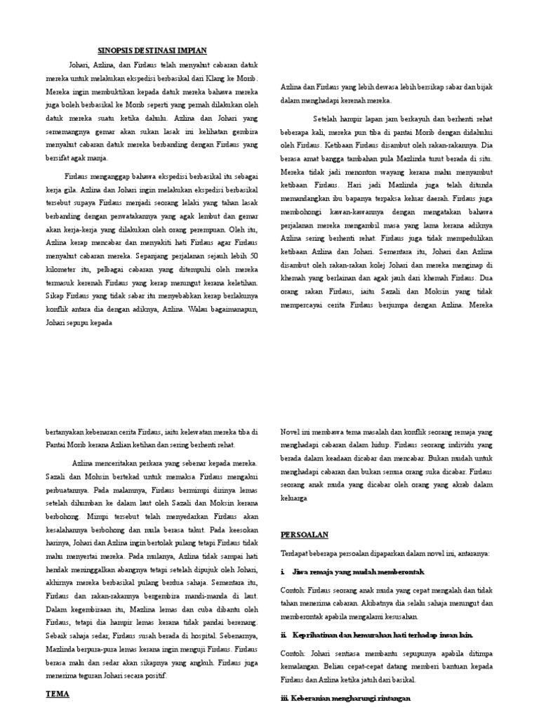 Sinopsis (novel tingkatan 1) sinopsis novel destinasi impian johari, azlina, dan firdaus telah menyahut cabaran datuk mereka untuk melakukan ekspedisi berbasikal dari klang.